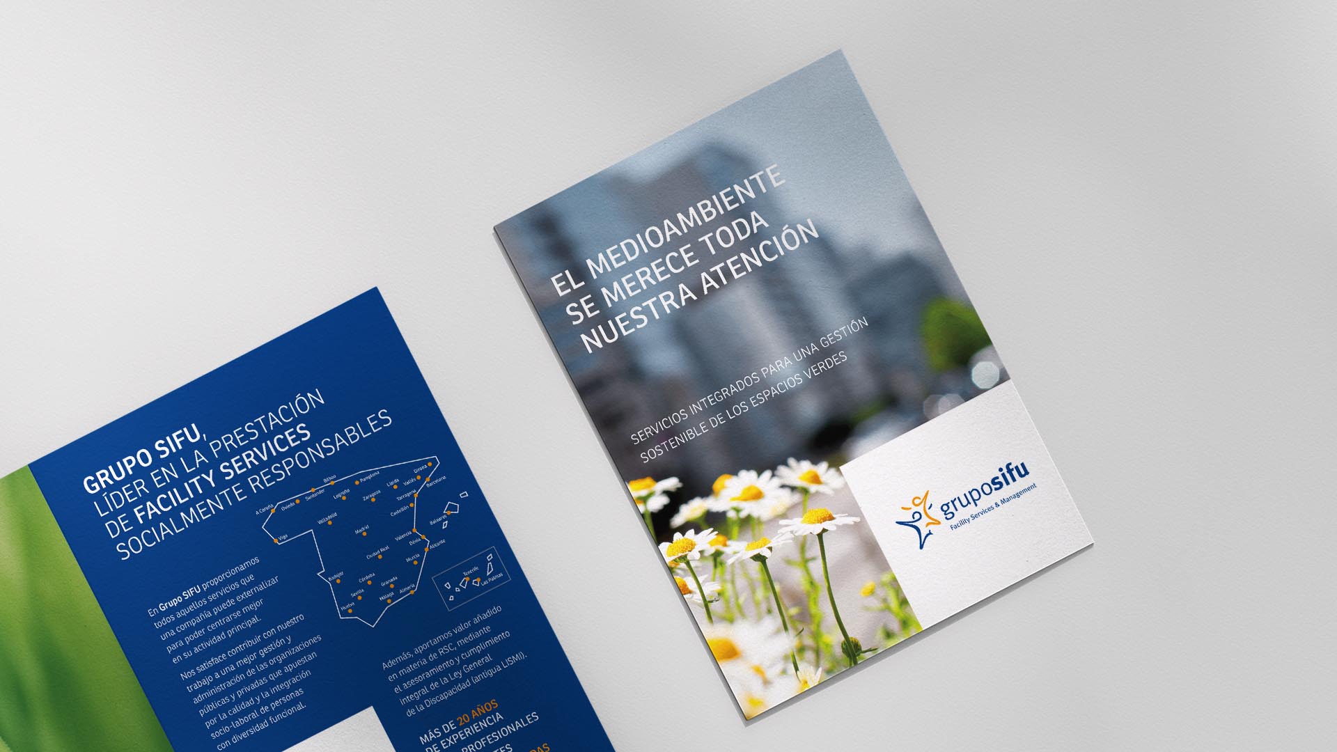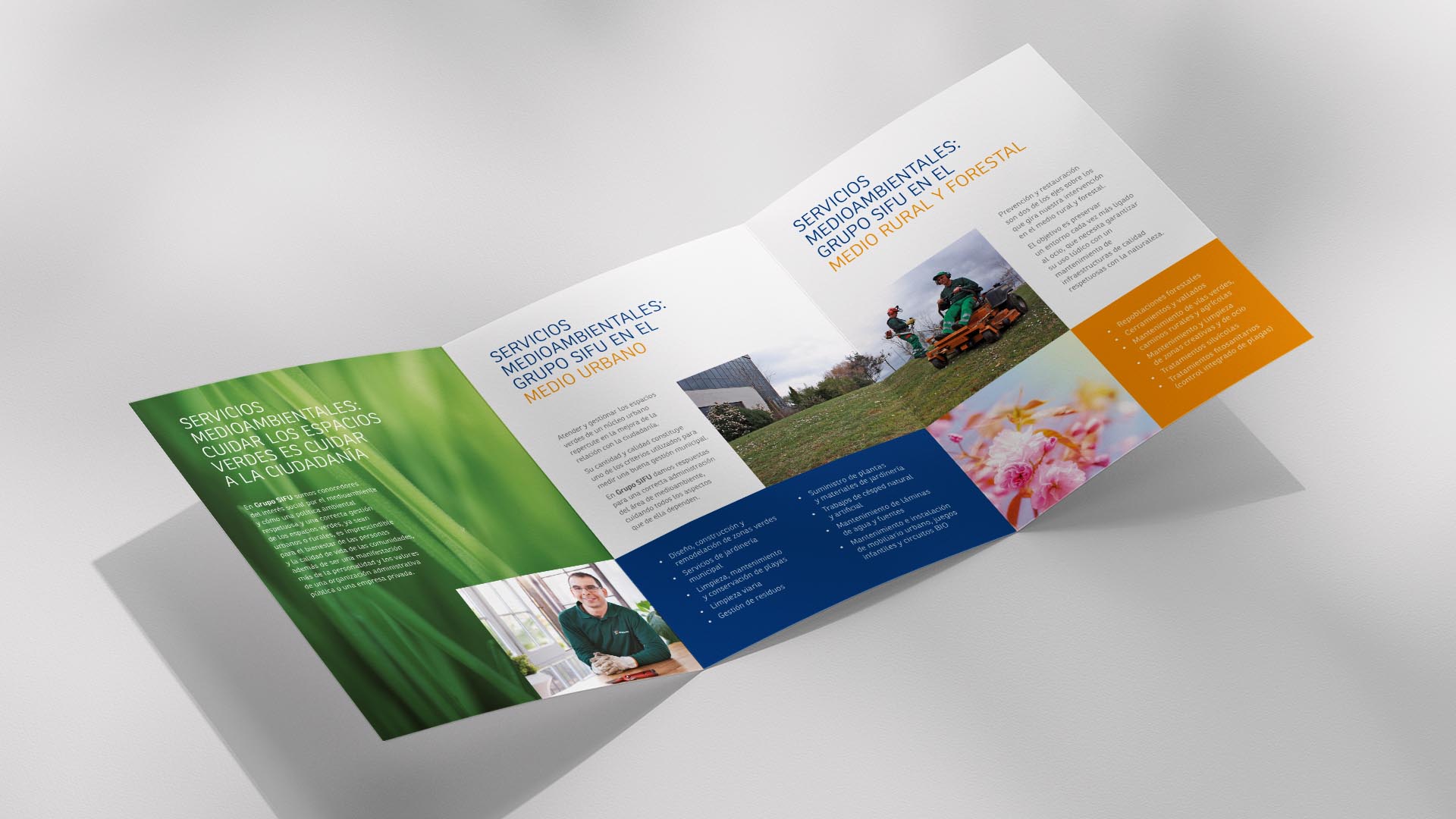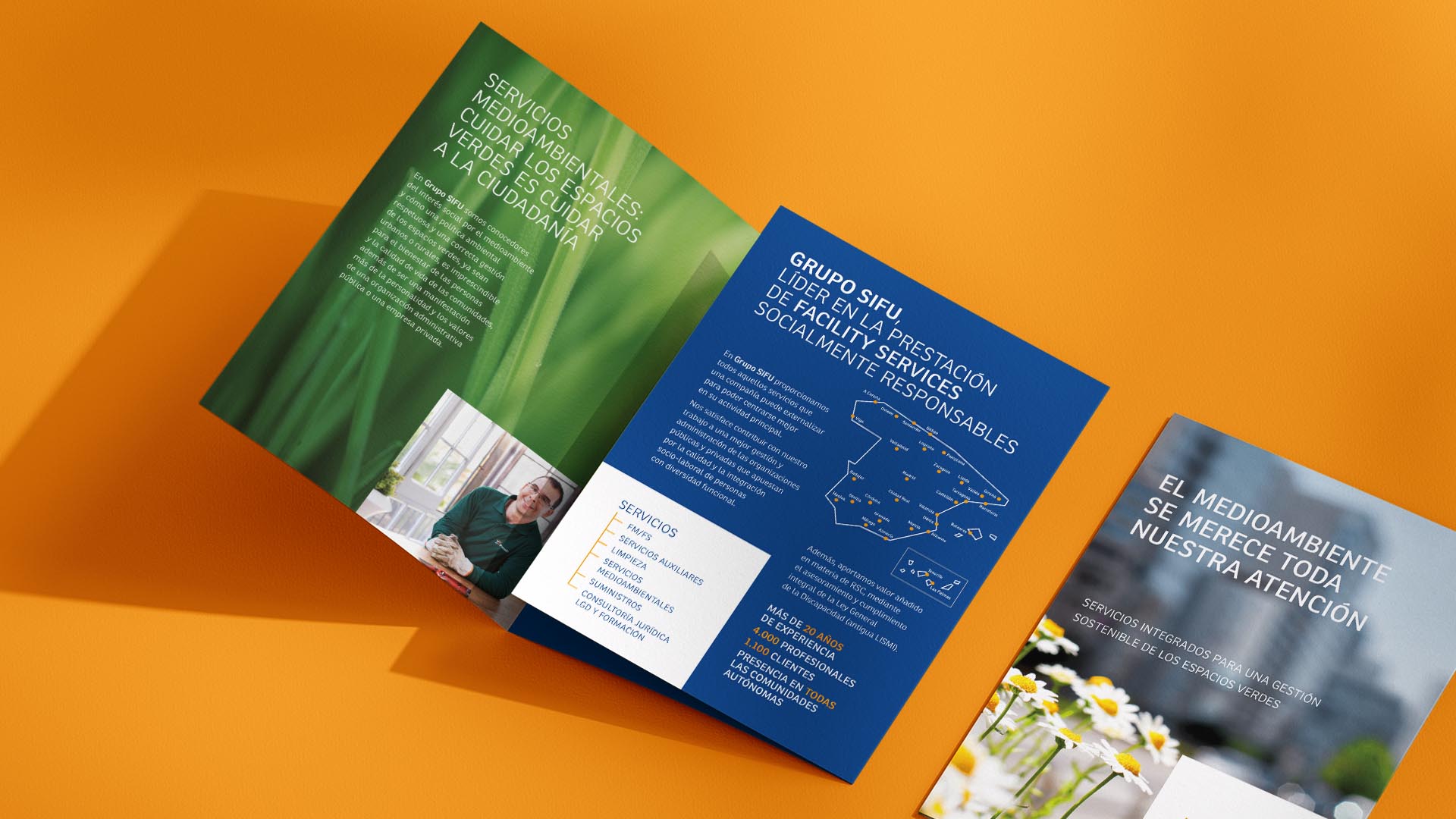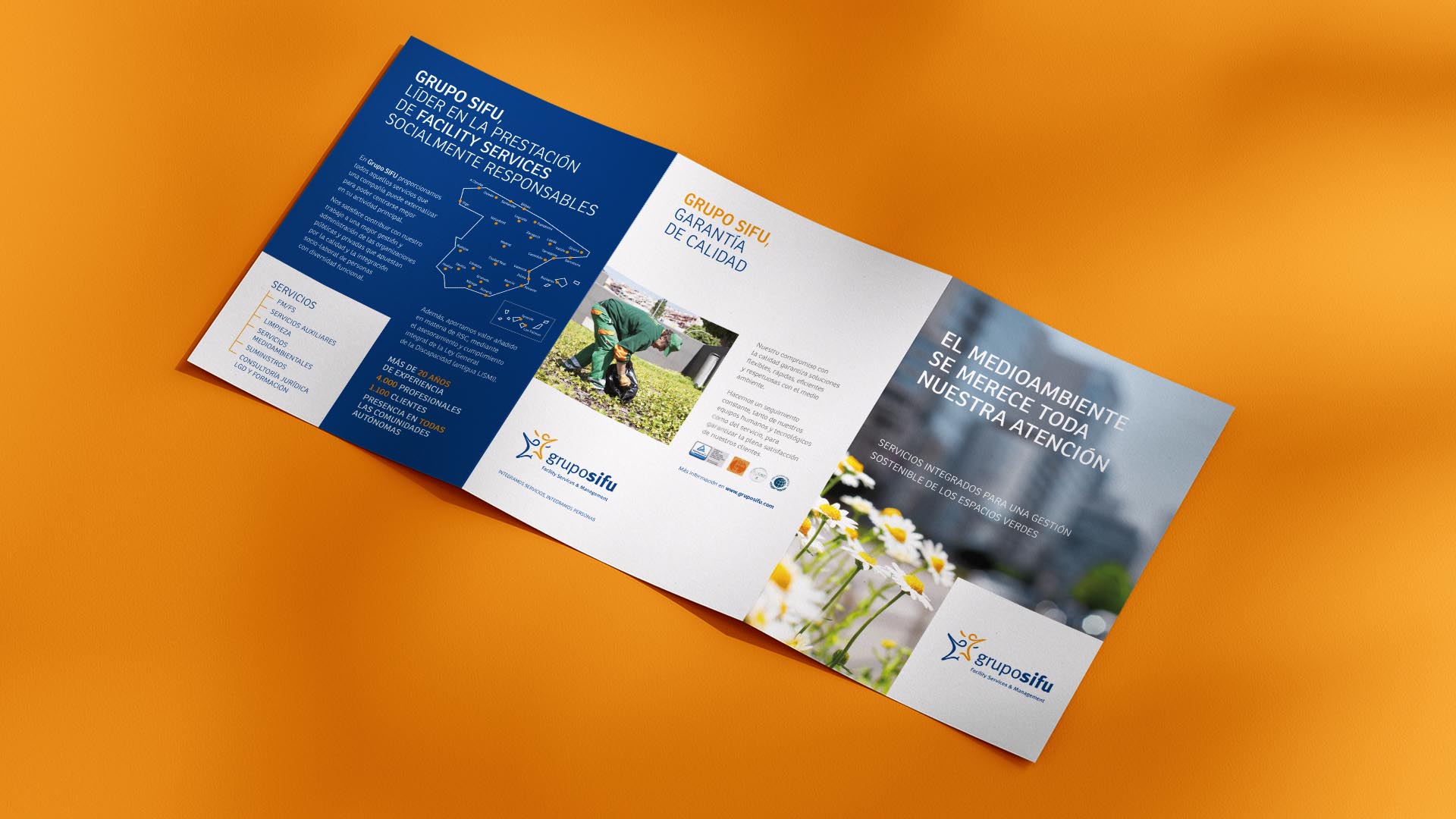 Disseny de tríptic corporatiu per a Grupo SIFU, empresa proveïdora de Facility Services. Producció d’arts finals per a impressió.