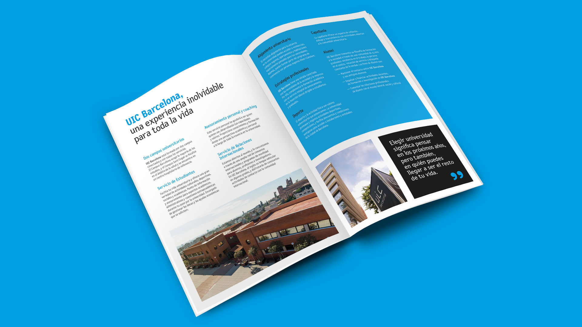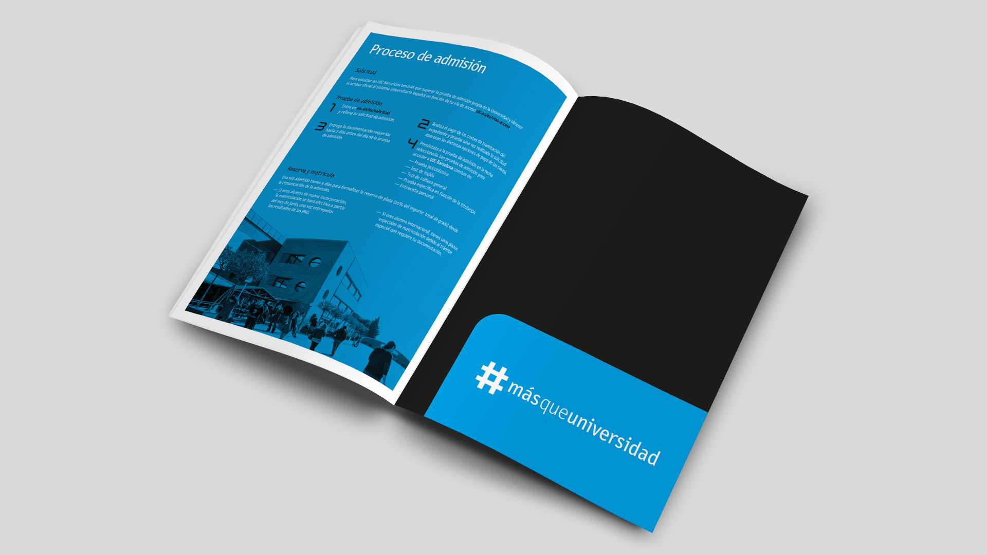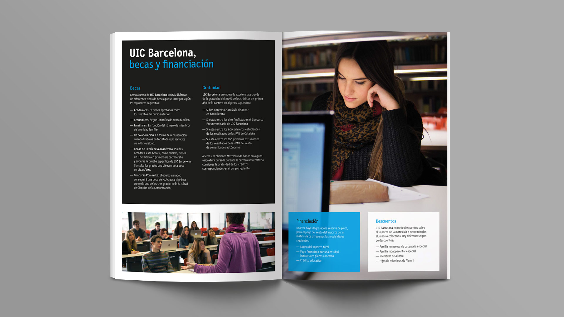 Proposta de disseny de fulletó corporatiu per a futurs estudiants de la universitat UIC Barcelona. La peça conté informació bàsica relativa al procés d’admissió, i una pestanya contenidora per adjuntar les fitxes dels diferents graus o postgraus.